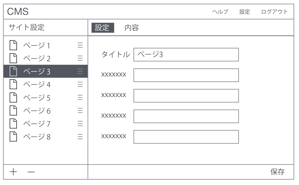 これはあるコンテンツ管理アプリケーションです。このアプリケーションではウェブサイトにページを追加したり、内容を編集したり、ページの順序を入れ替えたりできます。非常に単純なアプリケーションですが、もとのUIはタスクベースになっており、とても使いにくいものでした。以下の図はその中の一画面です。