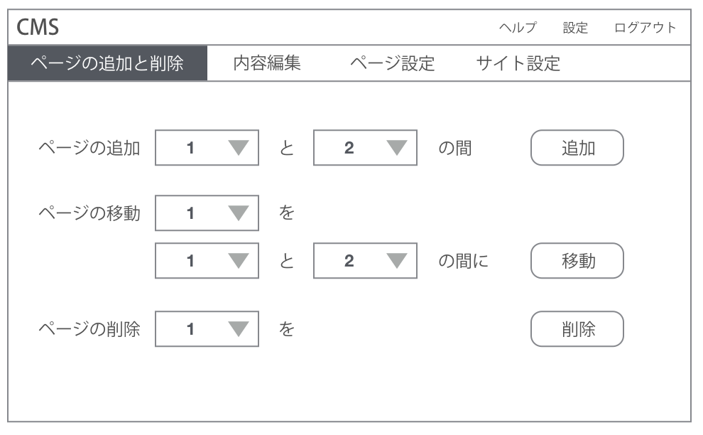 まずページ上部の水平メニューを見ると、「ページの追加と削除」「内容編集」「ページ設定」「サイト設定」となっており、これらは「やること」ですから、もうこの段階でだめなことがわかります。またこの図はメニューで「ページの追加と削除」が選ばれた状態ですが、ページを追加、移動、削除する操作がそれぞれ穴埋め式の小さなウィザードになっていて、GUI らしくないモーダルな表現です。