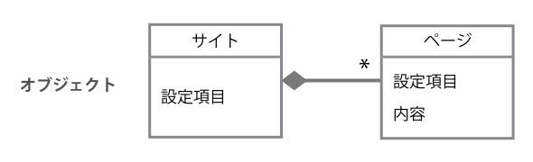 これをオブジェクトベースに改善するために、まずオブジェクト抽出を行います。画面内の名詞を集めると、主要なオブジェクトとしては「サイト」と「ページ」があるようです。サイトとページの両方には属性として「設定」と呼ばれる各種のメタ情報があり、ページにはさらに「内容」と呼ばれる属性があります。