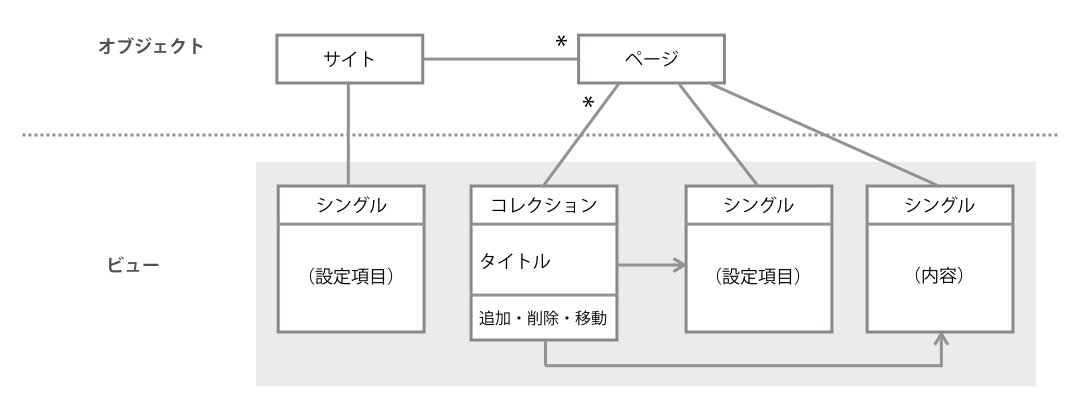 次にビューを考えます。「サイト」はこのウィンドウにおいてひとつしか扱われないようですから、コレクションは必要ありません。一方「ページ」にはコレクションとシングルが必要でしょう。コレクションにおいてはページを追加/削除したり、順序を変更するアクションが必要そうです。これを図にすると次のようになります。