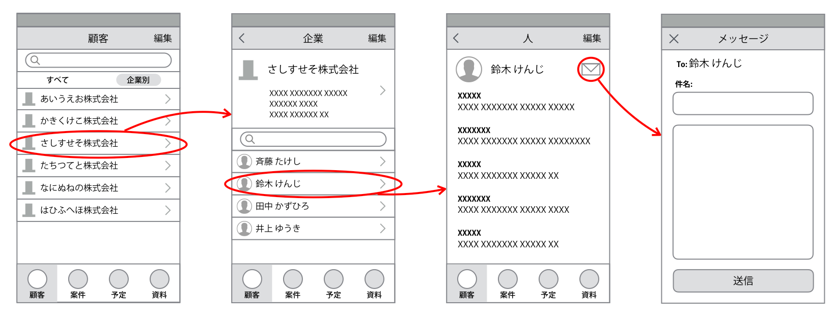 主要なオブジェクトである「顧客」「案件」「予定」「(営業)資料」を、最も上位のナビゲーションとしてタブにしています。顧客タブが選ばれた状態では、顧客の種類である「人」と「企業」のどちらからでも探せるようビューの切り替えができるようにし、「企業別」が選ばれた場合は企業の一覧(フィルタリング機能つき)が表示されるようにします。ひとつの企業を選択するとその企業の基本情報と社員のリスト(フィルタリング機能つき)が表示され、人をひとり選ぶとその人の詳細情報が表示されます。詳細情報の画面では、その人に対するアクションとして封筒アイコンのボタンがあり、これを押すとメッセージ送信の画面が表示されます。