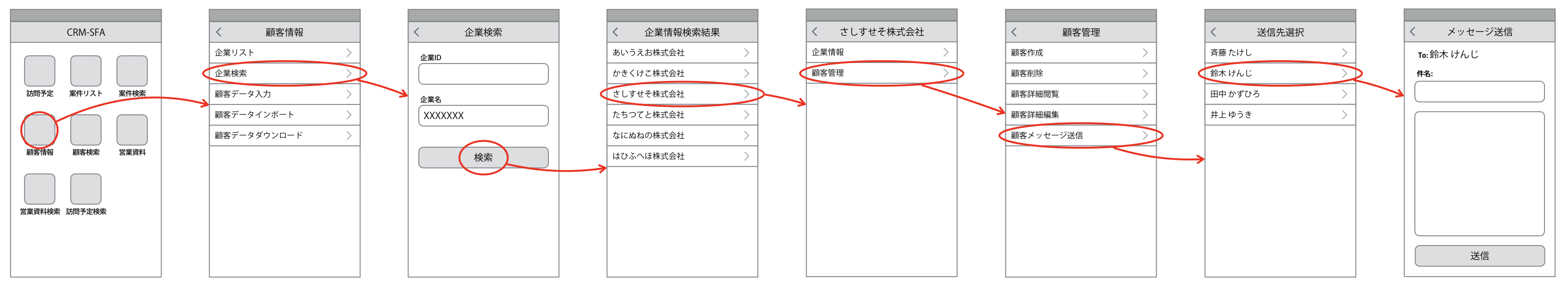 これはモバイル向けの顧客管理/営業支援アプリケーションです。もとのデザインはこのようになっていました。ユーザーが任意の顧客を探してメッセージを送信するまでのフローを図にしています。