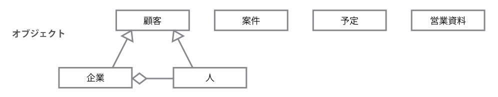 そこで、画面内で用いられている名詞を拾い集めて見ると、「顧客」「案件」「予定」「営業資料」といったオブジェクトが抽出されます。また顧客に注目すると、その概念はさらに「企業」と「人」に分けることができ、人は企業に属しているということがわかります。
