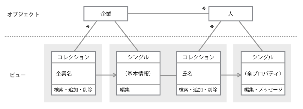 企業と人に絞って考えた場合、それぞれにコレクションとシングルのビューが必要だとすると、次の図のようなモデルが作れます。