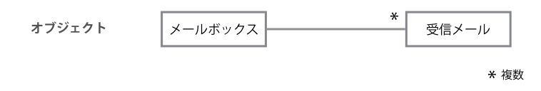 受信したメールは、通常、メールボックスに分類して管理するでしょうから、ユーザーが持っている概念としてはもうひとつ「メールボックス」というものもあることがわかります。つまり受信メールを扱うアプリケーションにおいては、「受信メール」と「メールボックス」というふたつの主要なオブジェクトがあるのです。また、ひとつのメールボックスには複数の受信メールが入りますので、その関係を図にすると次のようになります。
