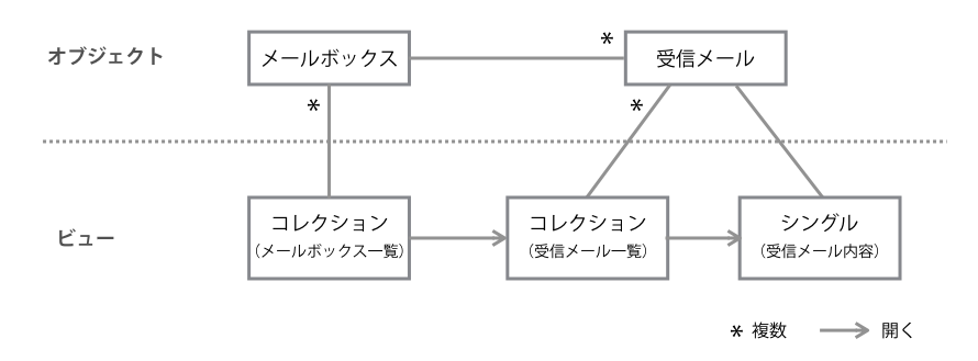 多くのオブジェクトはコレクションとシングルという二種類のビューを持ちますが、メーラーの場合、「メールボックス」については受信メールのコレクションを呼び出す手がかりでしかないので、画面上であまり強調する必要はなさそうです。ですからメールボックスのシングルビュー(詳細画面)は表に出さず、オプション的な扱い(メールボックスの設定画面としてなど)として良さそうです。