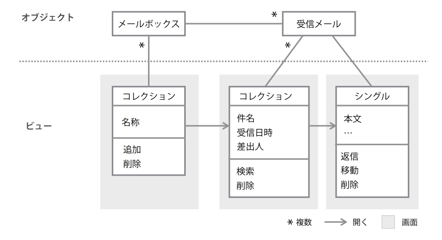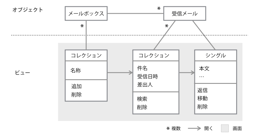 対象ドメインからオブジェクト(「メールボックス」と「受信メール」)が抽出されたら、次に、ビューを考えます。ビューとは、ウィンドウ、ページ、分割されたレイアウト内のひとつのペイン、メニューとして表示されるひとつのリストなど、ユーザーが実際に画面上で目にするひとまとまりの情報表示領域です。オブジェクトはビューを伴うことで具象化され、ユーザーに知覚されます。