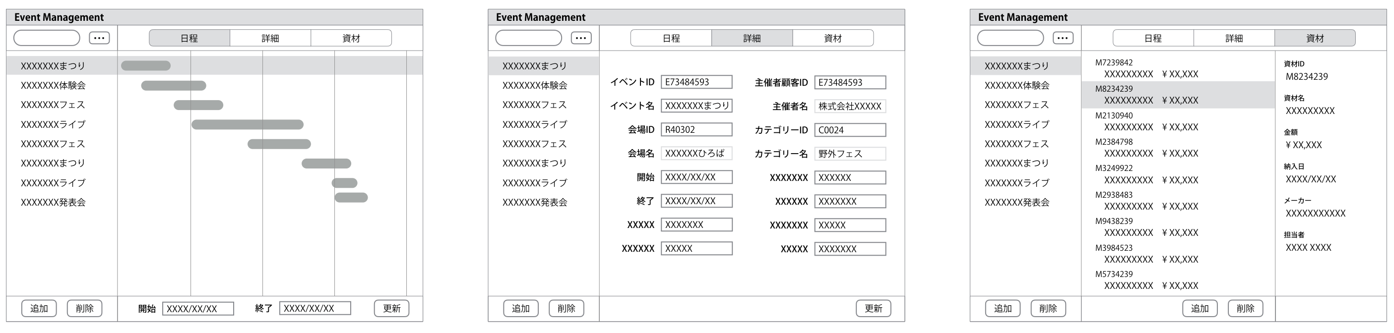 左ペインにイベントのコレクションを表示したまま、右ペインにイベントのシングルビュー(詳細情報)を表示できるようにします。同様に、イベントにひもづく資材のコレクションも呼び出せるようにします。