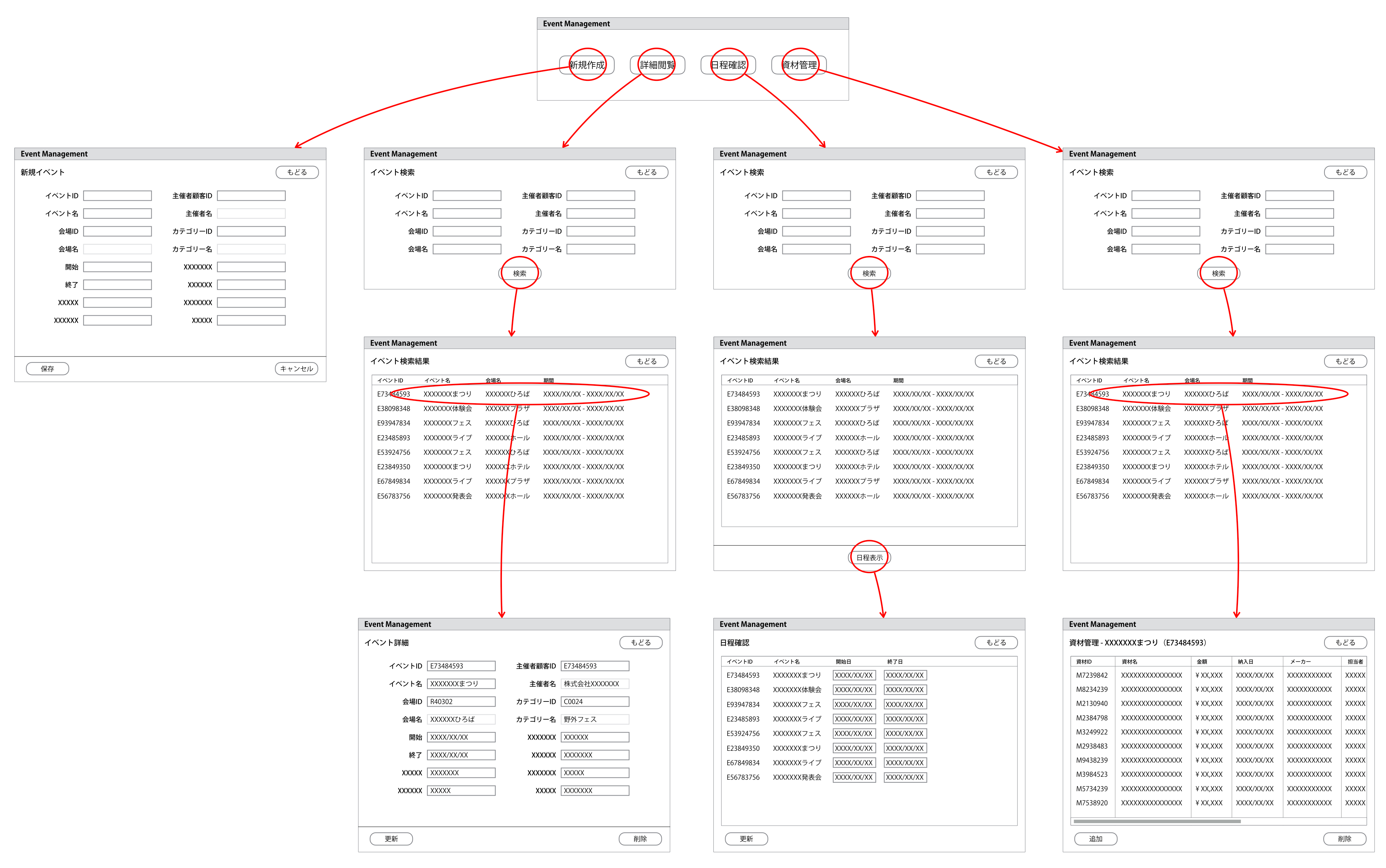 このアプリケーションでポイントとなるのは、もとのUIにおいて、「日程確認」というタスクが存在していたことです。各イベントには詳細情報がありますが、その中でも日程についてはイベント横断的に表示/変更できるようになっていました。新しいデザインではビューの表現でこの要求をよりよくサポートします。また横スクロールが発生していた資材管理の情報についてもビューの表現によって閲覧性を高めます。