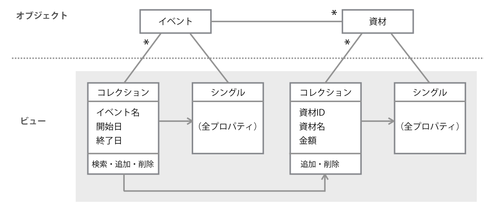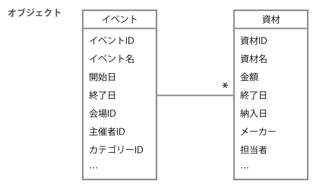 これをオブジェクトベースに改善するため、まずはオブジェクトを抽出します。するとこのアプリケーションでは「イベント」と「資材」というふたつのオブジェクトを扱っていることがわかります。