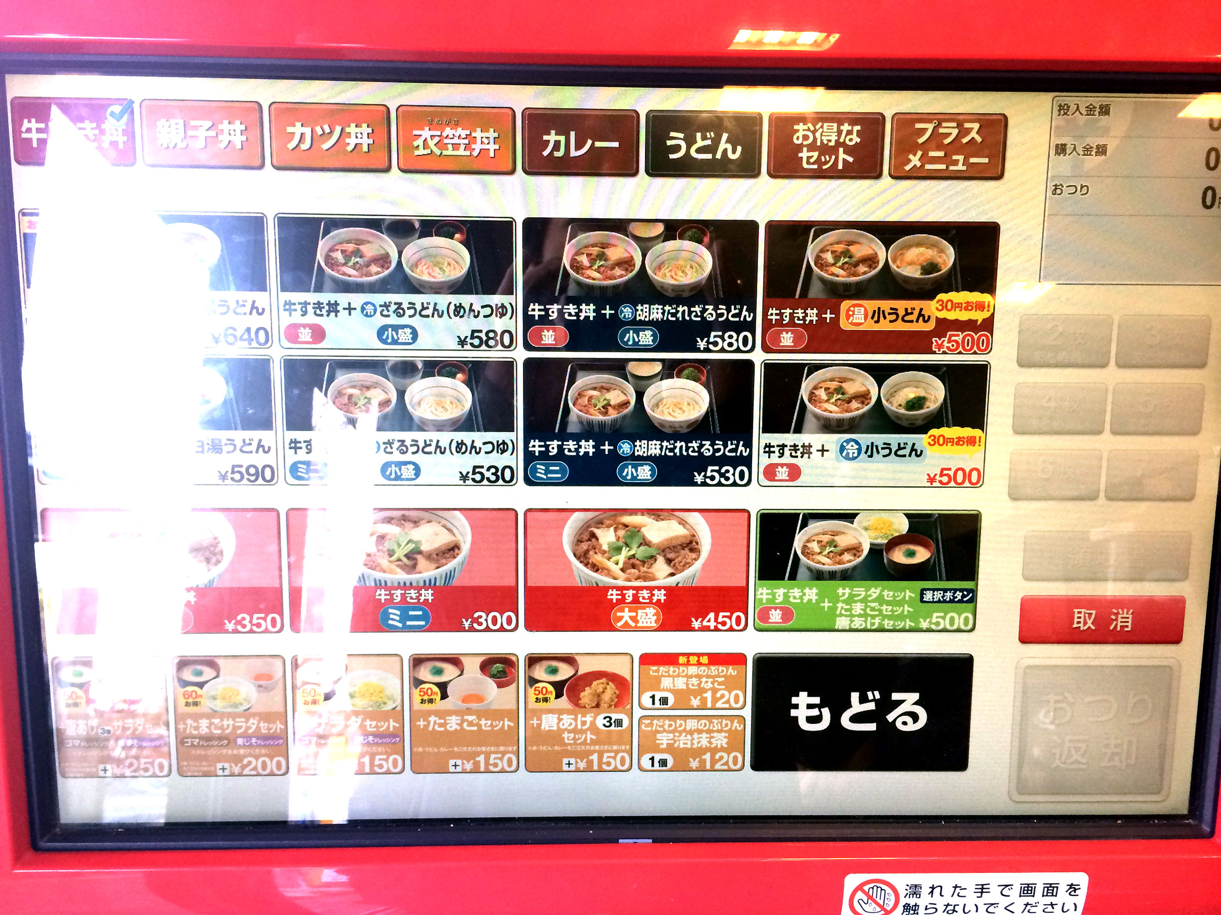 もう何年か前になりますが、昼食にいつもの牛丼チェーン店に行くと、タッチパネル式の食券販売機が新しく導入されていました。そのUIがとてもひどいのです。その販売機の画面ではまず、店内か持ち帰りかを選び、次に商品カテゴリーを選びます。すると次のようなメニュー画面が表示されます。
