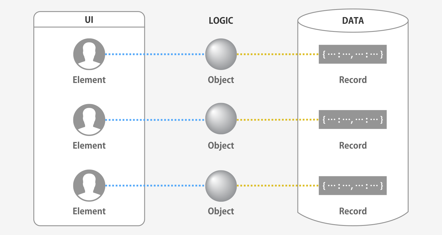 アプリケーションの中では、ひとつのオブジェクトが複数のビューで扱われるのが普通です。例えばパソコンには「ファイル」というオブジェクトがありますが、これは、デスクトップ、フォルダの内容を表示するウィンドウ、検索結果を示すダイアログ、といった複数のビューの中に現れるでしょう。