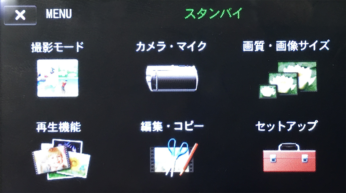 あるビデオカメラのタッチ式液晶パネルでは、操作メニューとしてこのような画面が表示されます。