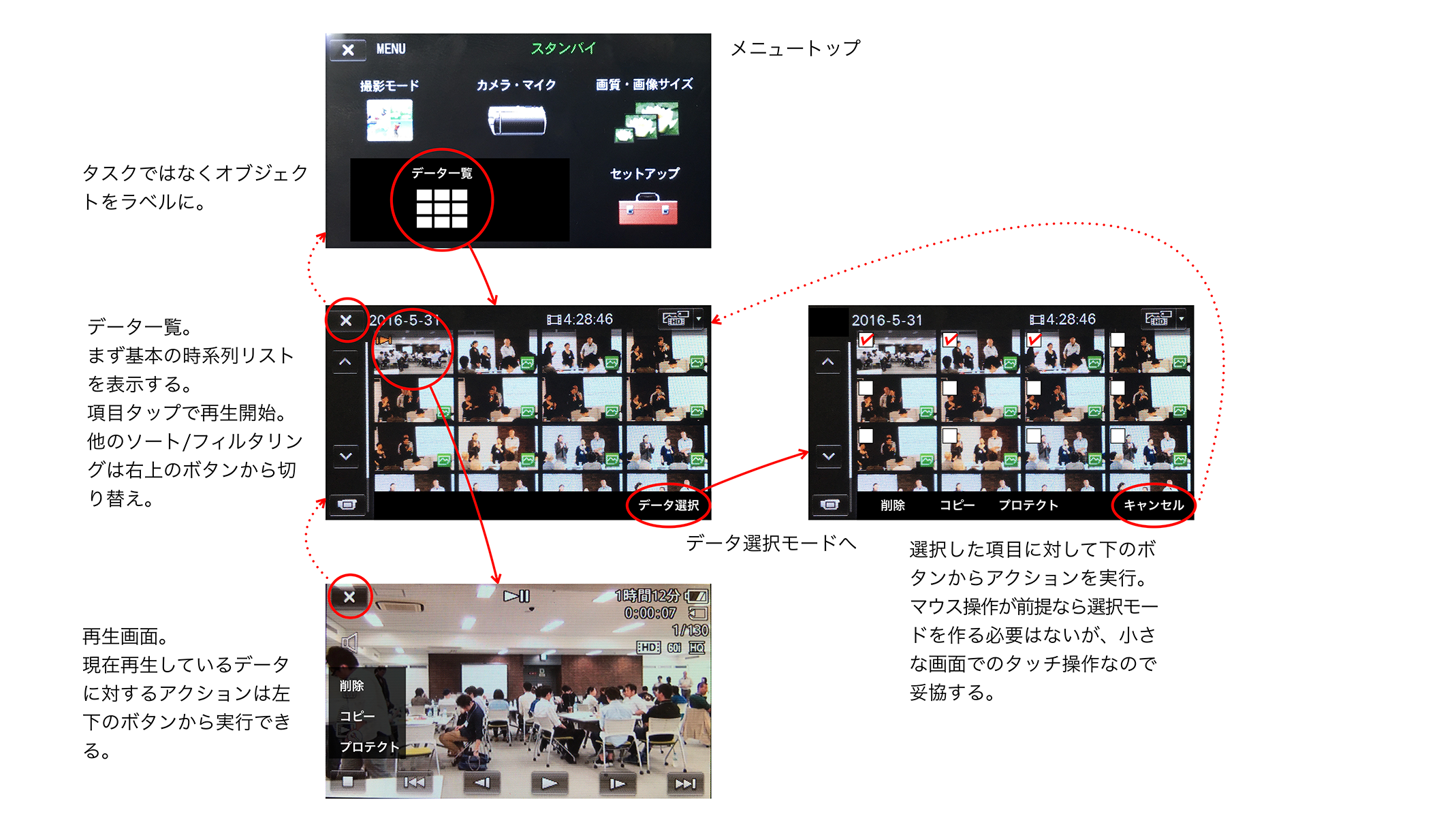 オブジェクトベースのUIでは、できるだけ早くユーザーに関心の対象物(録画データ)の一覧を提示します。「再生」や「編集」といった「やること」ではなく、「データ一覧」のようなラベルですぐにデータの一覧を見られるようにします。データの一覧はシンプルな時系列(または逆時系列)にして、それ以外のソート/グルーピング方法はオプション扱いにします。ユーザーは一覧画面や再生画面において、選択したデータに対する「削除」や「コピー」といったアクションを実行できます。このような構成にすれば画面数は大幅に削減され、インタラクションコストは下がり、プログラムもずっと簡潔になるでしょう。