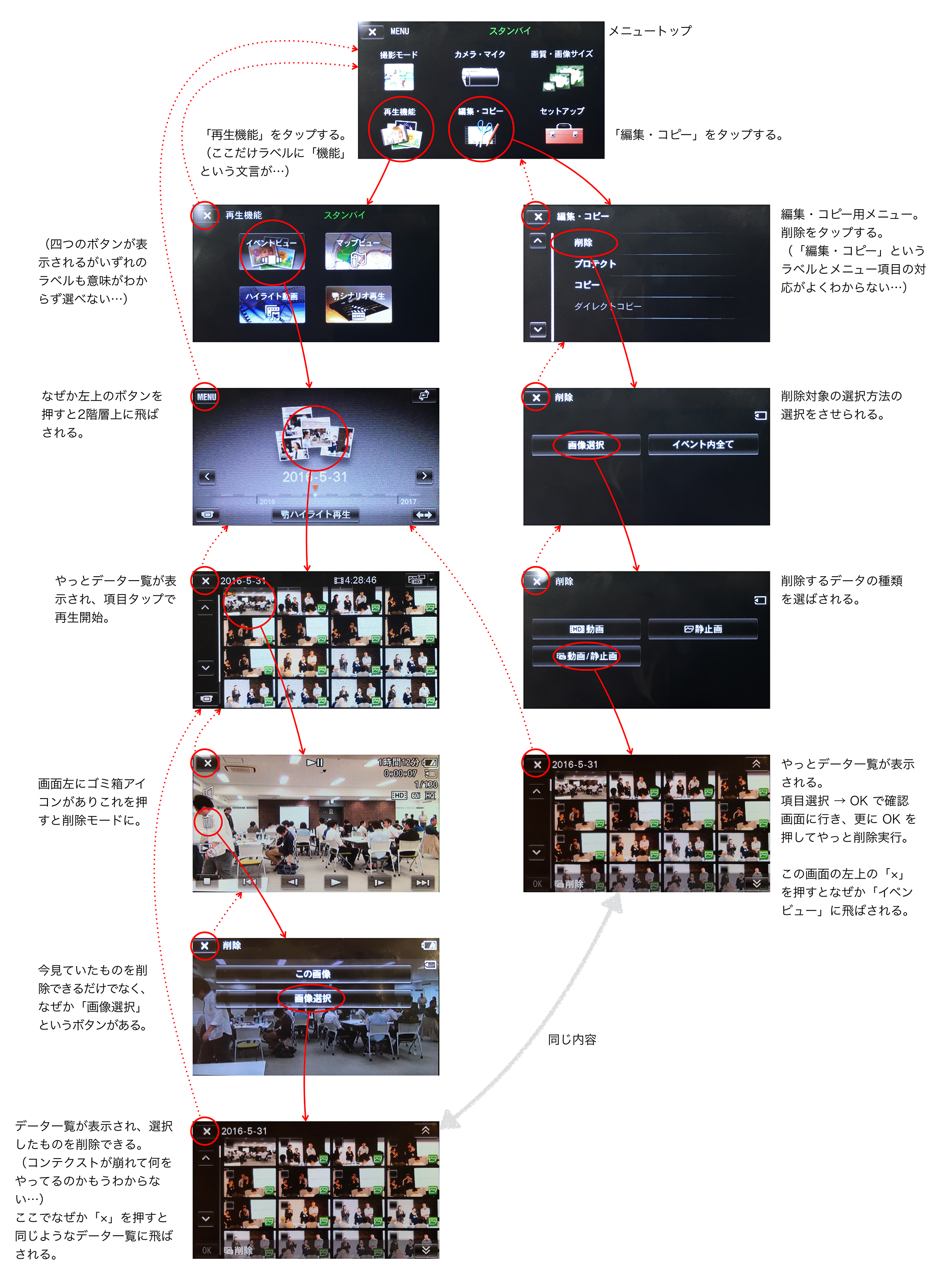 ユーザーが削除するデータの一覧に到達するまでには、「編集・コピー > 削除 > 画像選択 > 動画/静止画 > データ一覧」と、やはり数画面を経由しなければなりません。先に「やること」を選択し、そこから対象物が見えないまま暗いトンネルを進まなければならないタスクベースのUIは、インタラクションコストが高く(得られる結果に対してそこまでの認知的/身体的負荷が不当に大きい)、ストレスになるのです。